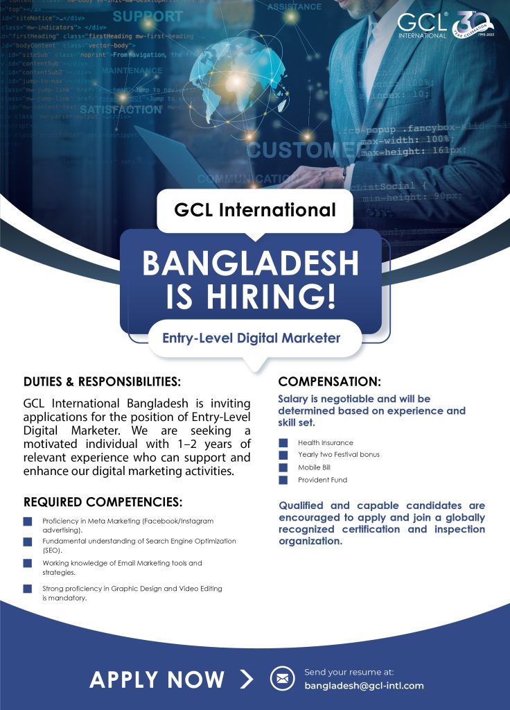 GCL International Bangladesh is hiring Position: Entry-Level Digital Marketer GCL International Bangladesh is inviting applications for the position of Entry-Level Digital Marketer. We are seeking a motivated individual with 1–2 years of relevant experience who can support and enhance our digital marketing activities. Required Competencies: Proficiency in Meta Marketing (Facebook/Instagram advertising). Fundamental understanding of Search […]